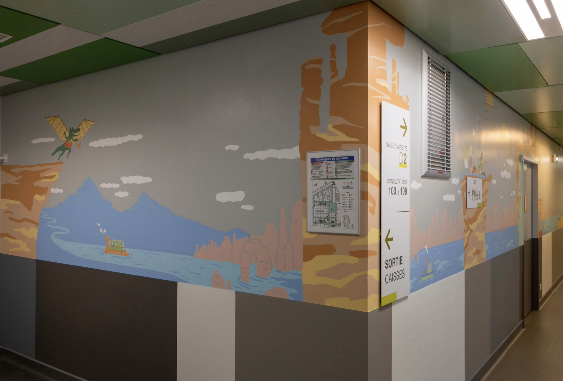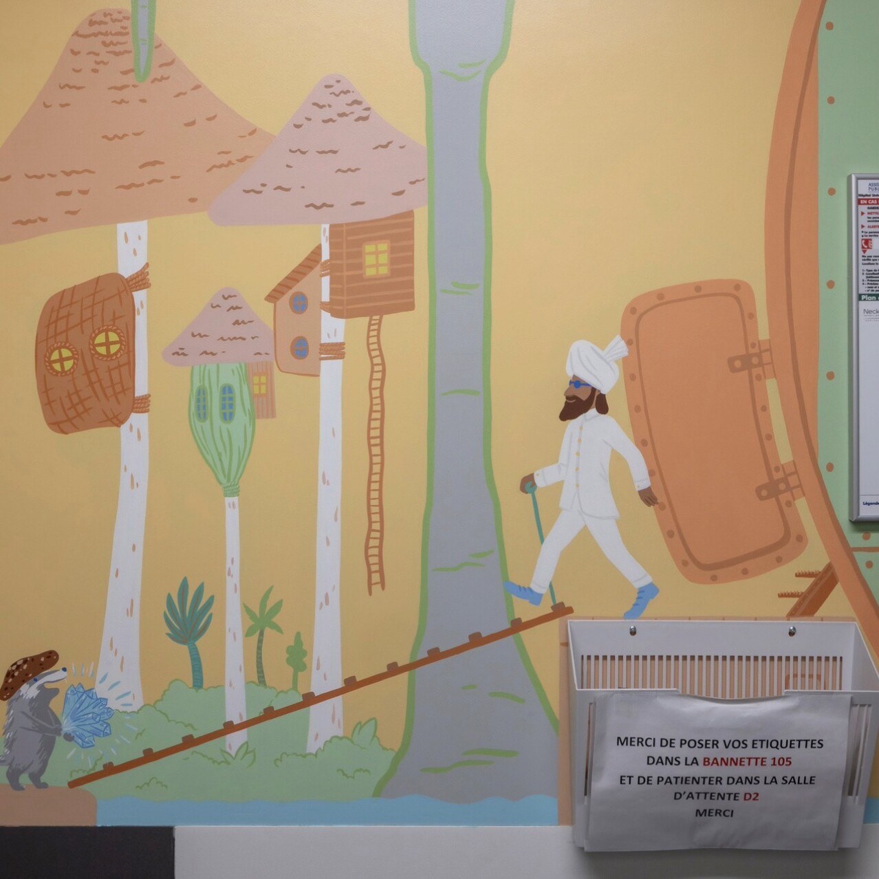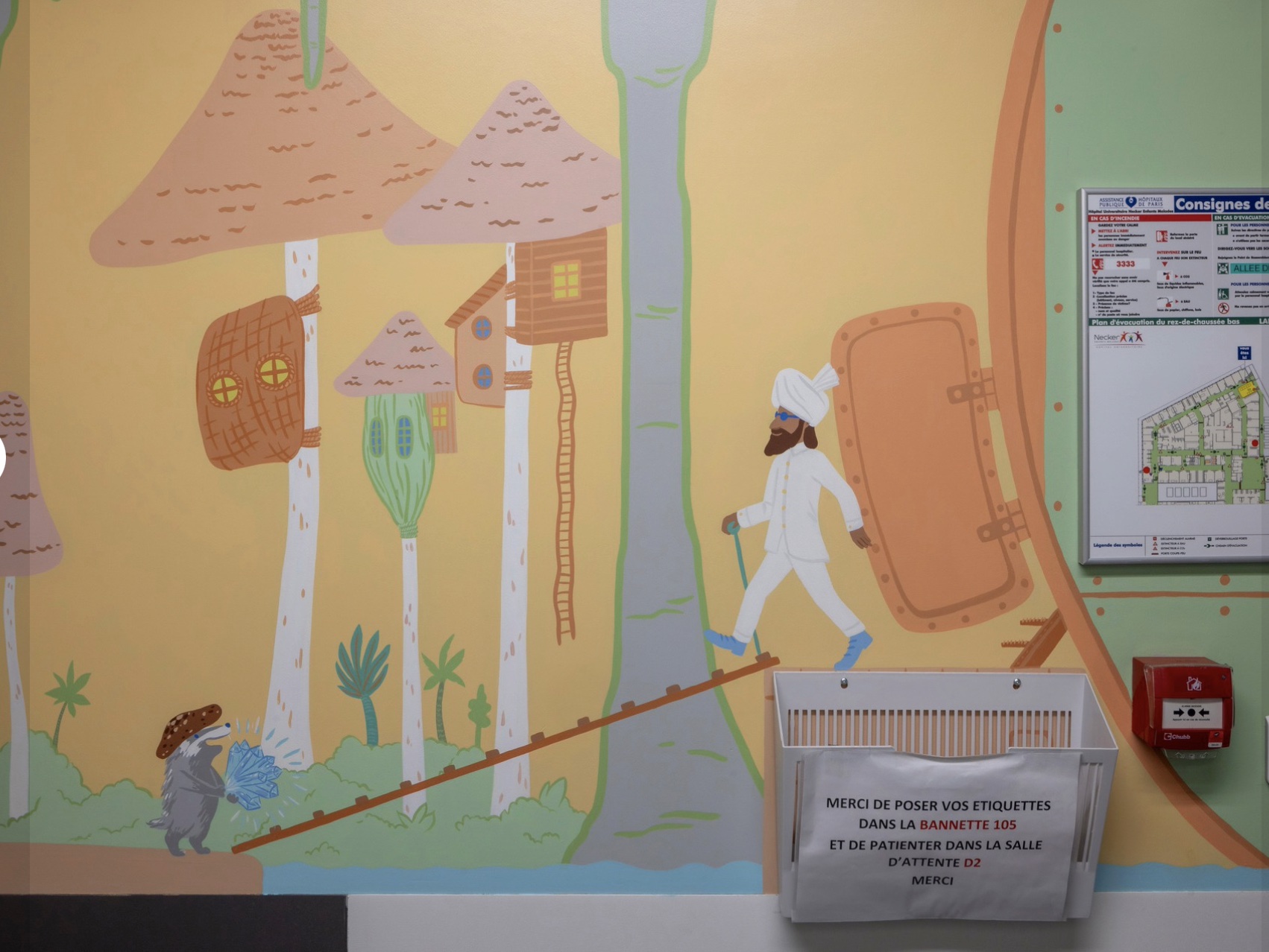 Nous réalisons des fresques décoratives pour les services pédiatriques où intervient Main dans la Main et Solidaires. Depuis 2015 nous avons réalisé 7 projets entre l’hôpital Necker, la Fondation Ophtalmologique Rothschild et l’hôpital Bicêtre. Nous essayons d’élaborer des oeuvres spécifiques à chaque service en dialoguant avec l’équipe soignante et l’équipe de Mdms pour définir le thème et l’univers graphique. Ces dialogues et les retours des patients nous touchent et nous poussent à essayer de créer des oeuvres rigolotes et lumineuses.