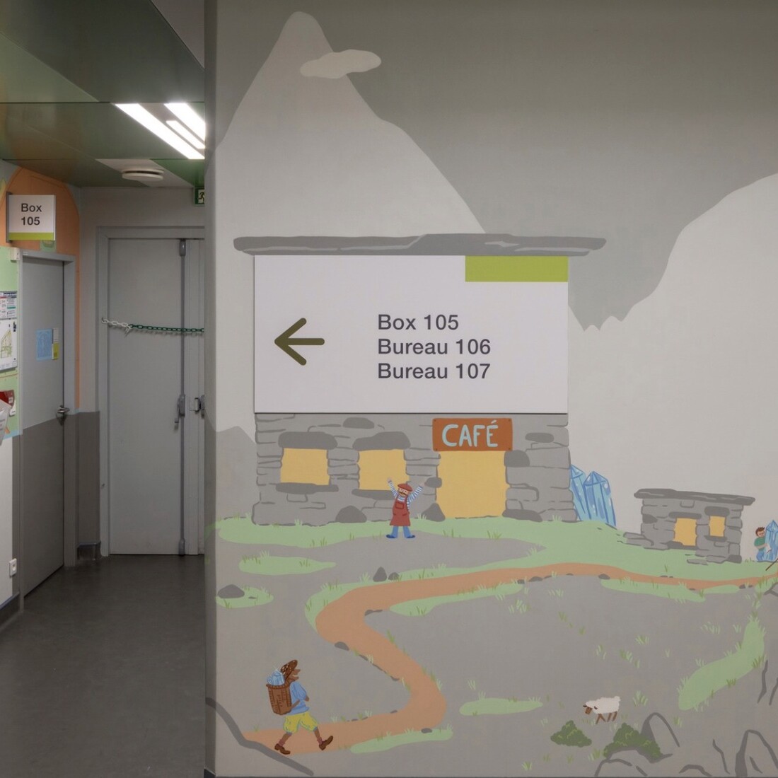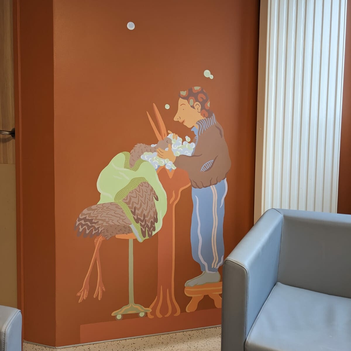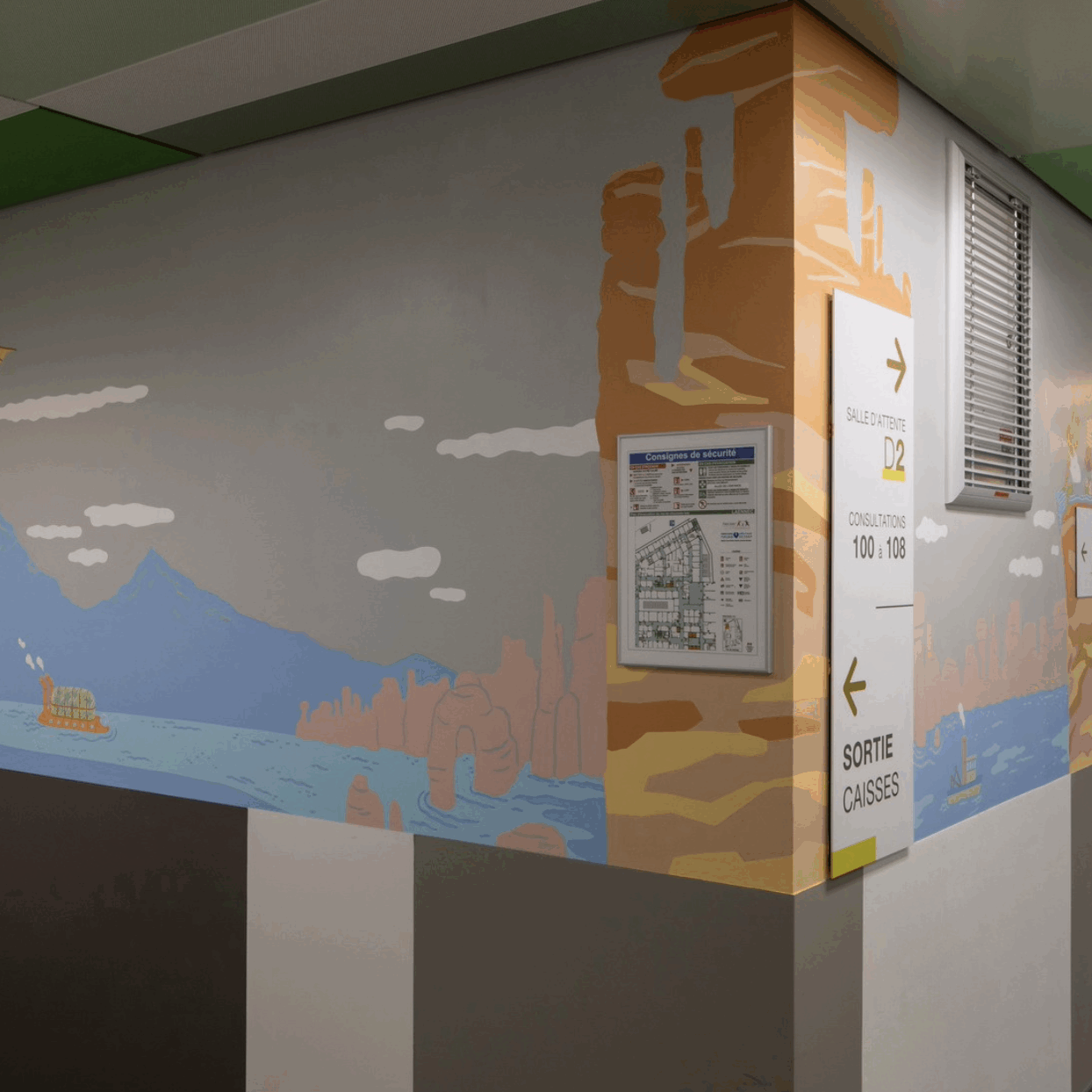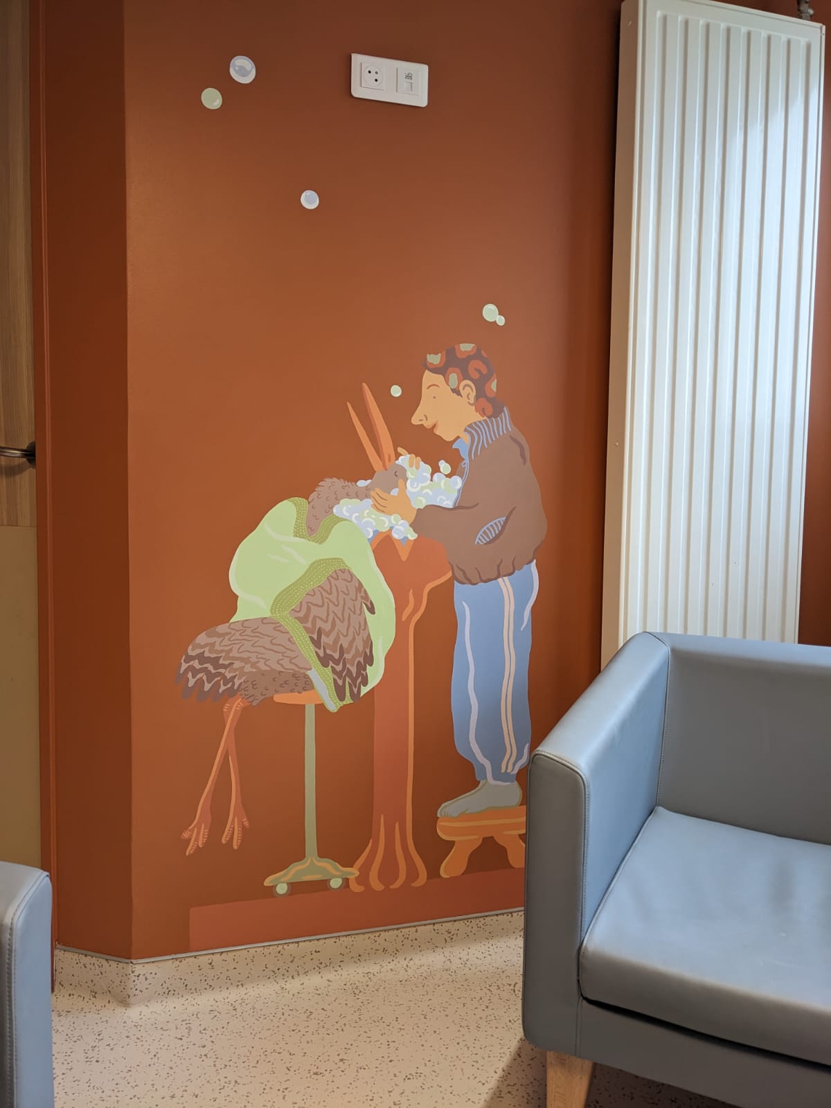 Nous réalisons des fresques décoratives pour les services pédiatriques où intervient Main dans la Main et Solidaires. Depuis 2015 nous avons réalisé 7 projets entre l’hôpital Necker, la Fondation Ophtalmologique Rothschild et l’hôpital Bicêtre. Nous essayons d’élaborer des oeuvres spécifiques à chaque service en dialoguant avec l’équipe soignante et l’équipe de Mdms pour définir le thème et l’univers graphique. Ces dialogues et les retours des patients nous touchent et nous poussent à essayer de créer des oeuvres rigolotes et lumineuses.