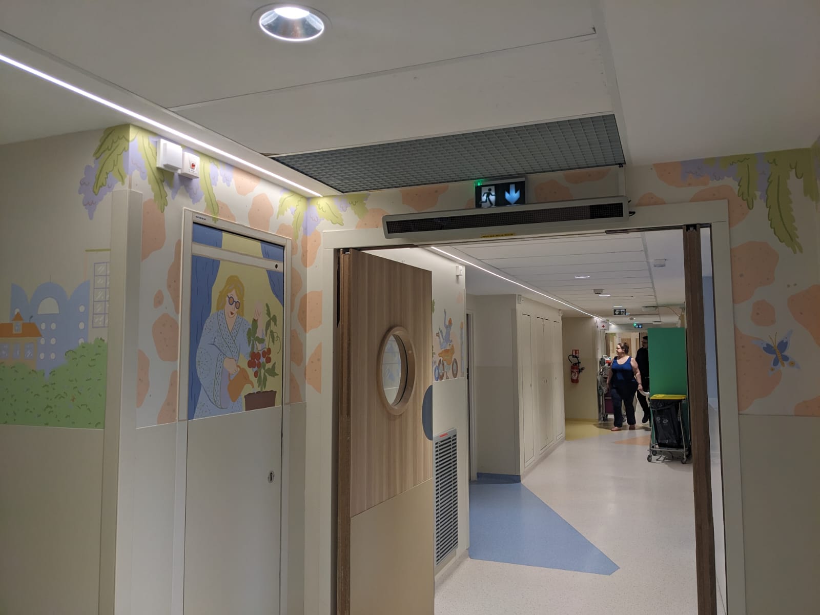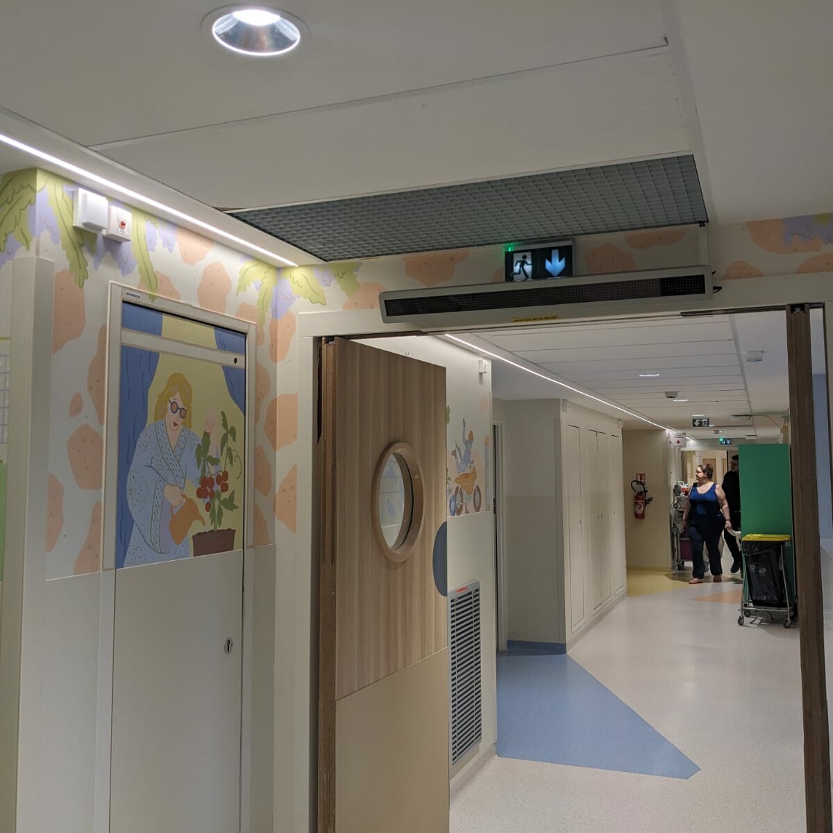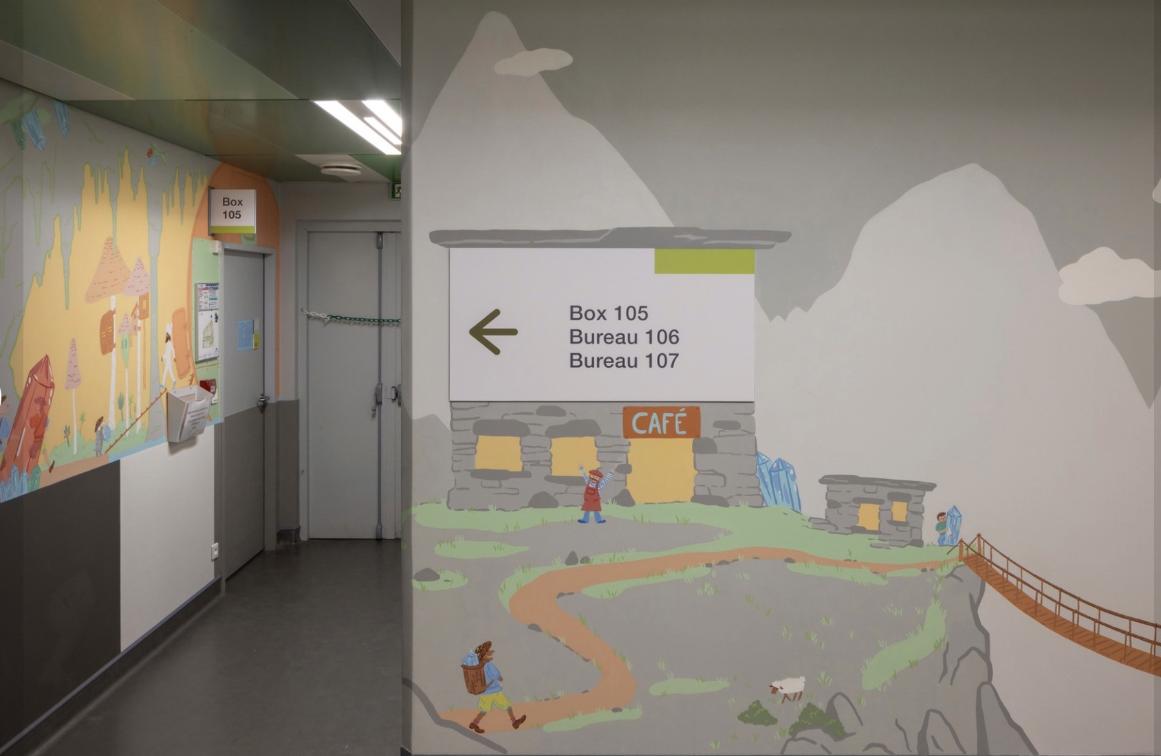Je réalise également des fresques murales et fausses fenêtres dans les espaces dédiés aux parents, pour adoucir leur quotidien.