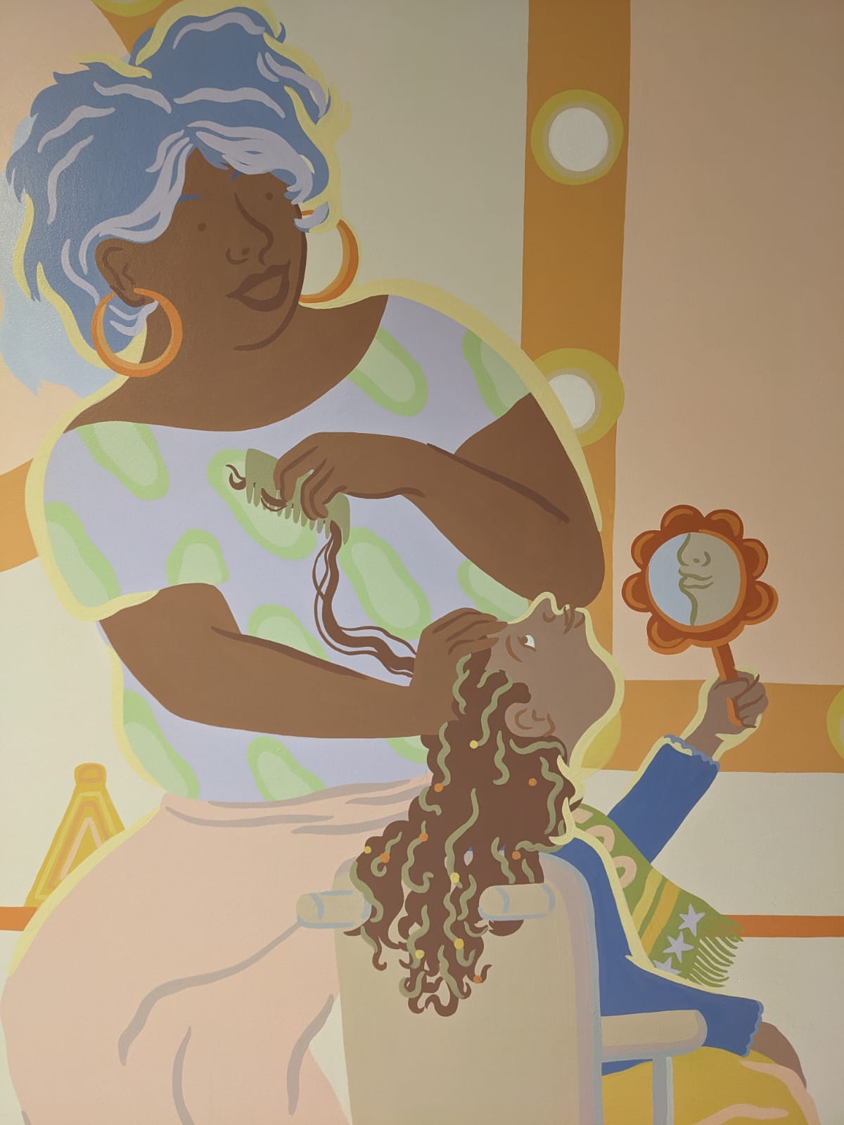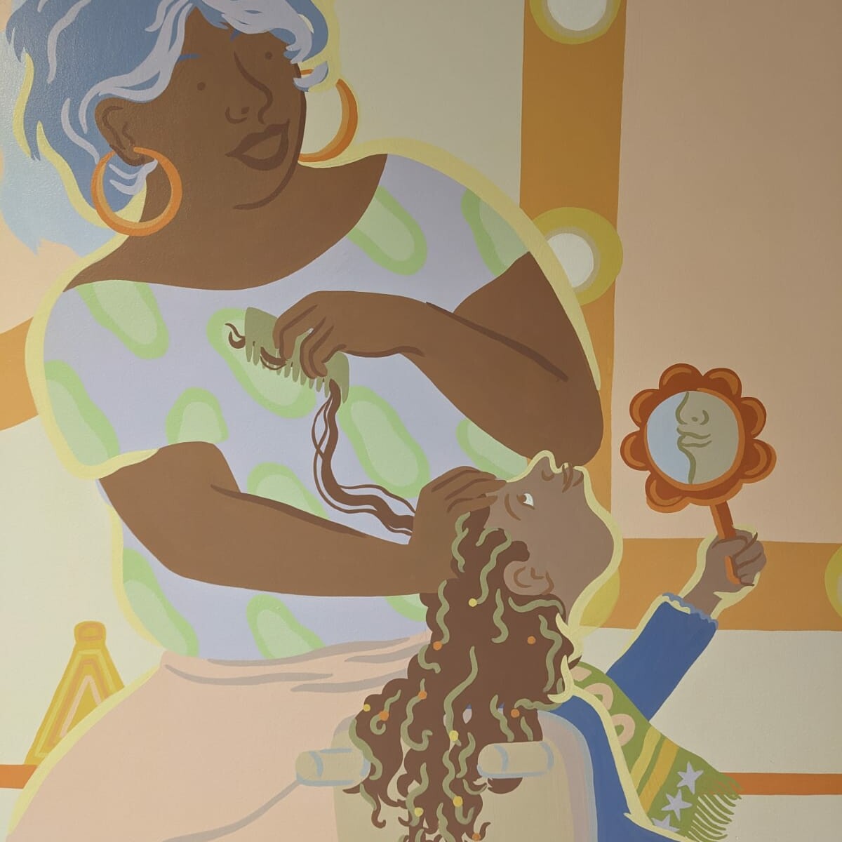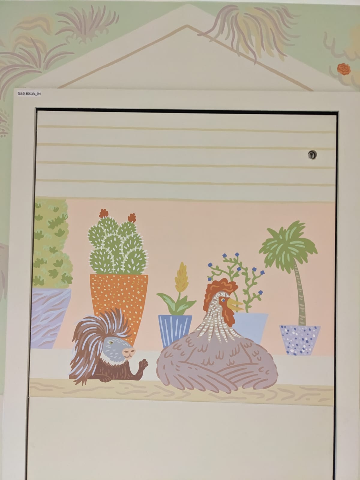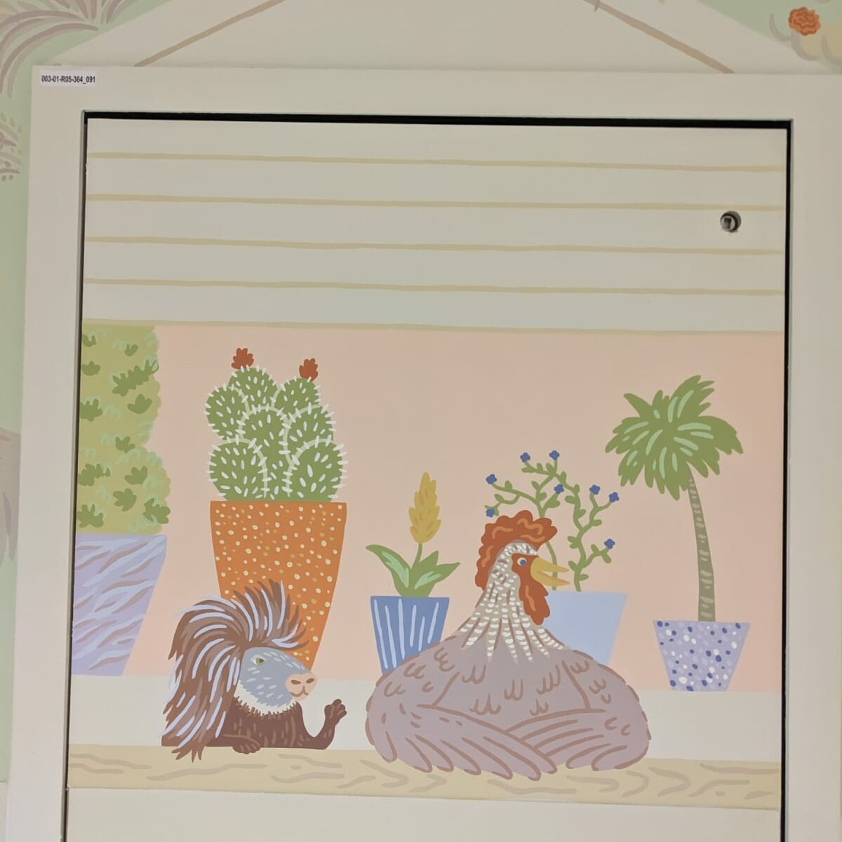 Je réalise également des fresques murales et fausses fenêtres dans les espaces dédiés aux parents, pour adoucir leur quotidien.